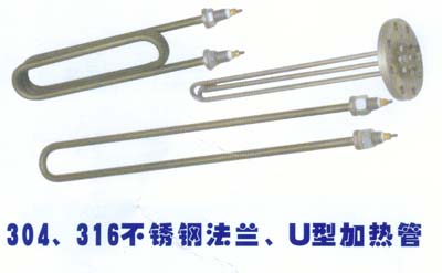 不锈钢法兰、U型加热管法兰间用衬垫密封。在耐高温不锈钢无缝管内均匀地分布高温电阻丝,在空隙部分致密地填入导热性能和绝缘性能均良好的结晶氧化镁粉,这种结构不但先进,热效率高,而且发热均匀,当高温电阻丝中有电流通过时,产生的热通过结晶氧化镁粉向金属管表面扩散,再传递到被加热件或水中去,达到加热的目的。